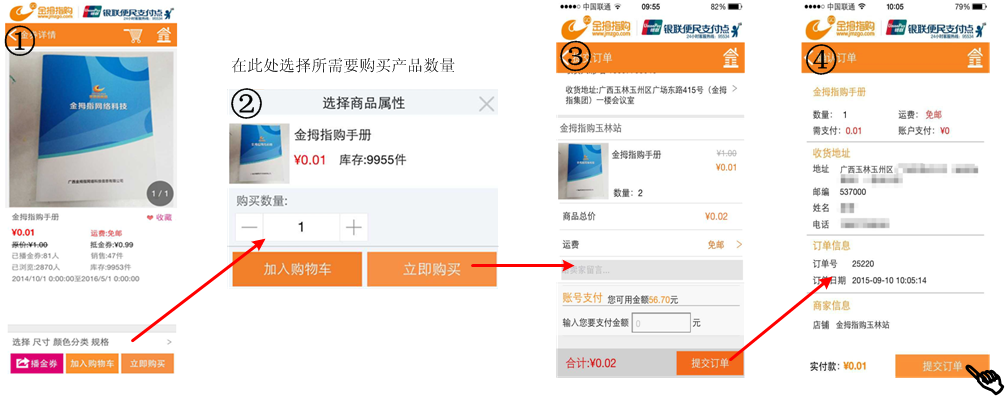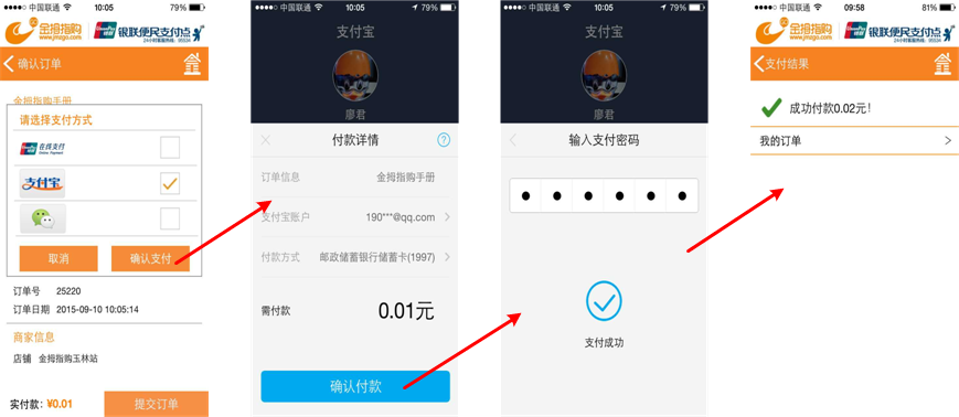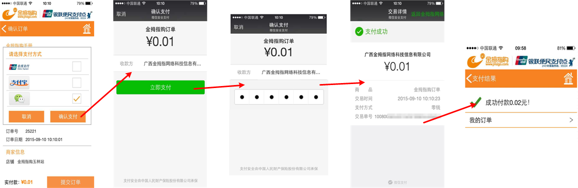 付款流程: (提交订单后选择支付方式:银联支付、微信支付、 支付宝支付、账户余额支付)